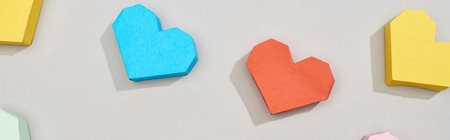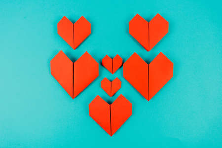 Origami hearts made of paper on blue background