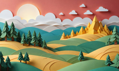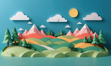 A papercraft landscape with green hills, mountains, trees, and a yellow sun in a bright blue sky