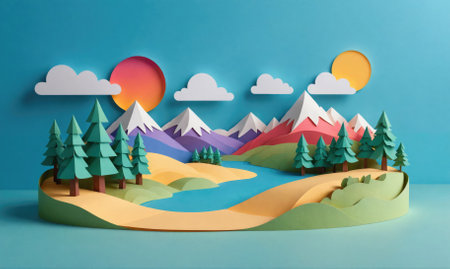 A paper-cut landscape features a winding river, snow-capped mountains, and a forest of pine trees under a bright blue sky