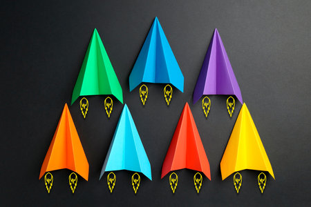 Colorful paper planes rushing forward on black background
