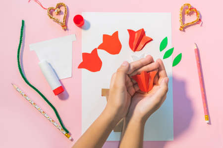 Children gift for Birthday or Mothers Day. How to make paper flower for greeting card. Simple creative art project. Step by step instructions.