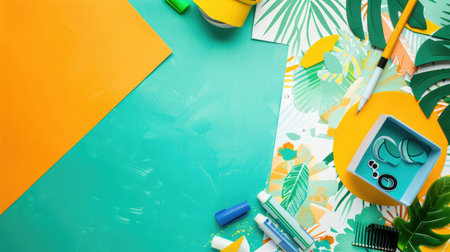 Composition with school stationery on color background. Creative flat lay back to school concept. various writing tools and other school stationary