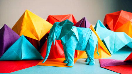 Captivating origami elephant commands attention amid a backdrop of vivid geometric paper forms. A delightful burst of color and creativity perfect for design projects and whimsical themes.