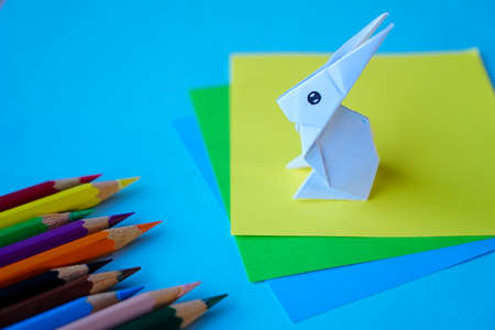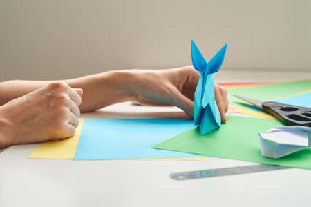 Origami lessons. Woman make origami easter rabbit from color paper. DIY concept
