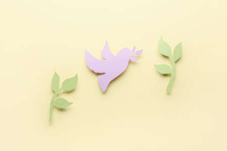 Paper dove and olive branches on color background. International Day of Peace