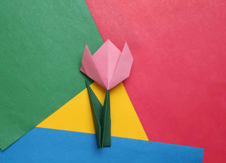 Origami bright tulip flower on colored paper background.
