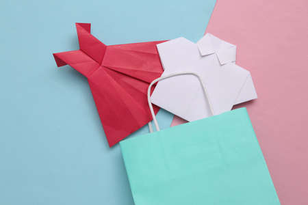 Shopping bag with origami dress and shirt on pink blue background. shopping concept