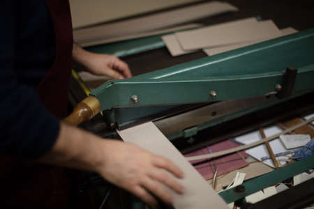 Man cutting paper and card on a large guillotine on a work table in a book binders workshop in a close up view