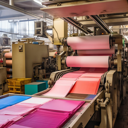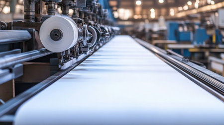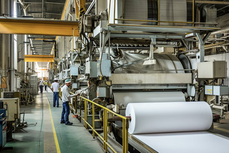 A detailed view of a paper production line showcasing advanced machinery in a modern industrial facility. The image captures the workflow of manufacturing high-quality paper, emphasizing precision and technology in production.