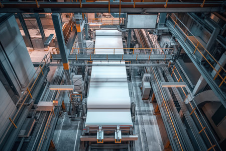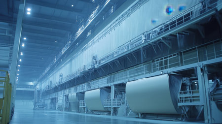 A stunning view of a state-of-the-art paper production facility showcasing advanced machinery and automated processes, emphasizing efficiency and innovation in industrial production.