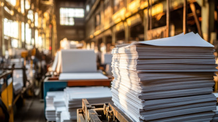 A vibrant scene capturing stacks of white paper in an industrial warehouse bathed in warm natural light, showcasing the essence of productivity and organization in a working environment.