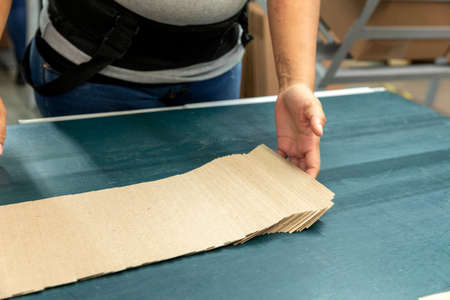 Handcrafted precision in a busy box manufacturing plant with dedicated workers applying cardboard for production