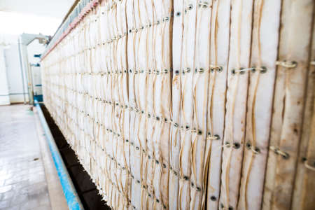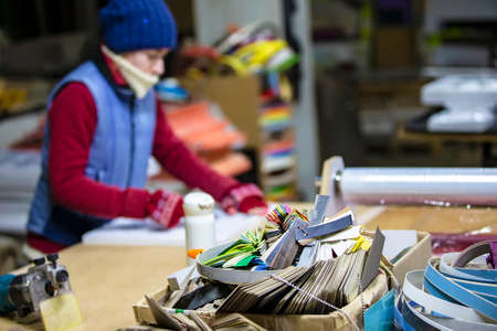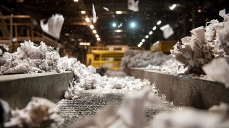 Crumpled paper on conveyor belt in factory. Shallow depth of field