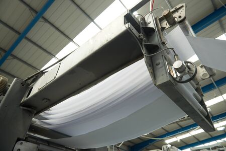 Modern paper production plant. Close-up of industrial equipment. Coated paper and cardboard