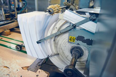 A industrial commercial envelope making machine, making paper envelopes for international distribution. Automated engineering machinery for mass production of paper envelopes.
