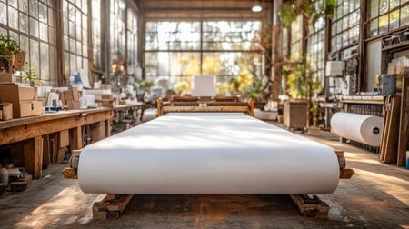 Close-up of a large roll of handmade paper on an industrial machine in a workshop, showcasing the texture and details of the manufacturing process.