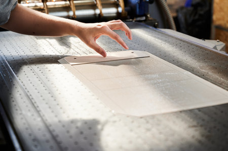 Closeup medium shot focusing on hands swapping out a synthetic mesh screen on a commercial printing press.