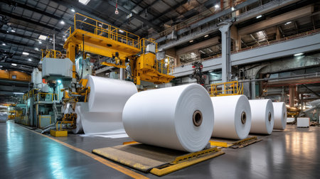 This image showcases an industrial paper production facility featuring advanced machinery and large rolls of paper. The setting highlights the efficiency and technology used in modern manufacturing processes.