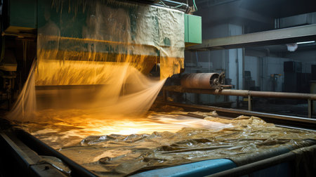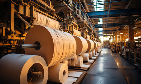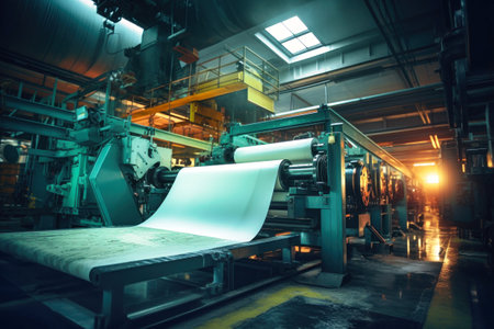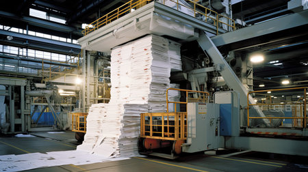 pulp and paper factory, with massive machinery producing paper from raw materials, created with generative ai