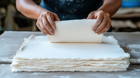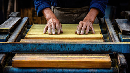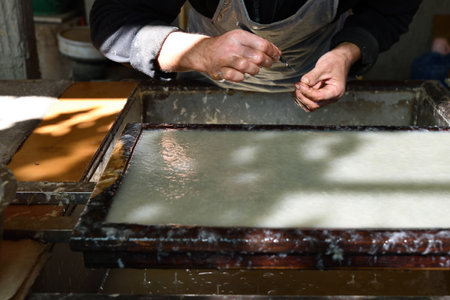 An artisan performs the traditional craft of papermaking,carefully lifting a screen frame from a large vat of pulp slurry. Water drips from the newly formed sheet of paper,showcasing a meticulous,hands-on process in a workshop setting.