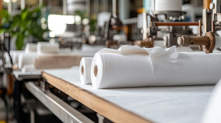 Rolls of white fabric await processing in a bright textile manufacturing facility, showcasing an organized workspace filled with production equipment.