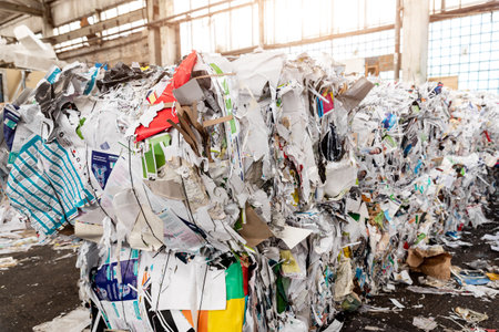 Kiev, Ukraine - March 06.2020: Pile of used paper wrap and document against bales of compressed cardboard collected for recycling and reuse at industrial plant recycle factory. Sustainable material