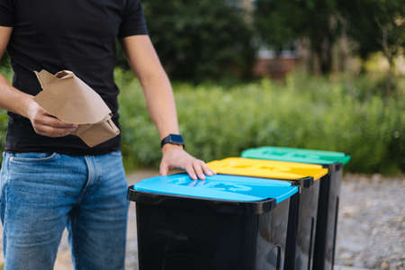 Close-up of man throwing peace of cardboard in recycling bins. Humen hand holding paper near the plastic bin