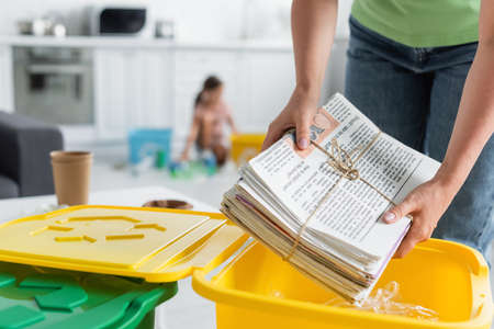 Cropped view of woman holding newspapers near trash can with recycle sing in kitchen