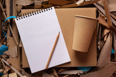 Recycling concept and waste paper heap. Coffee cup and product from recycled paper