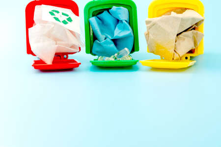 Garbage sorting concept with toy waste bin on paper background