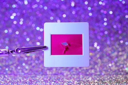 Two diapositive photo slides on pink table, view from above, space for text right side