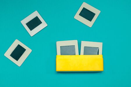 Retro 35mm Slide Photo Collection in Vibrant Yellow Box on Turquoise Background