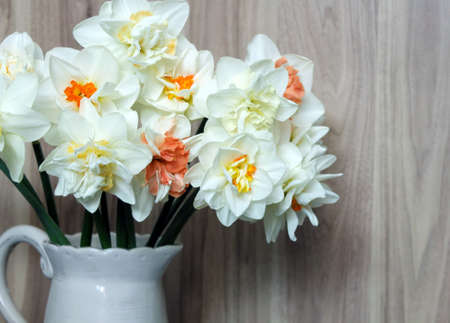 Narcissus flowers bouquet in white vase on light wood background