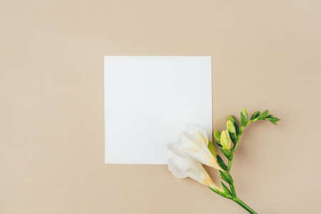 Floral background. One freesia flower on a beige background. Minimal concept. Flat lay, top view. Copy space for text.
