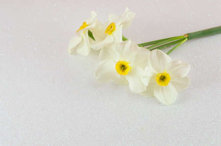 Narcissus flowers bouquet on white silk background