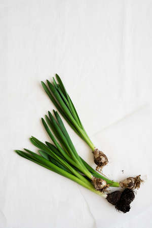 Flowers bulbs on white background, nature plant flat lay