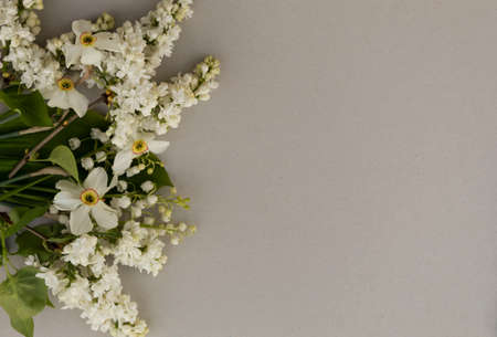 On a light background on the left are white flowers of lilac, daffodils and lilies of the valley.