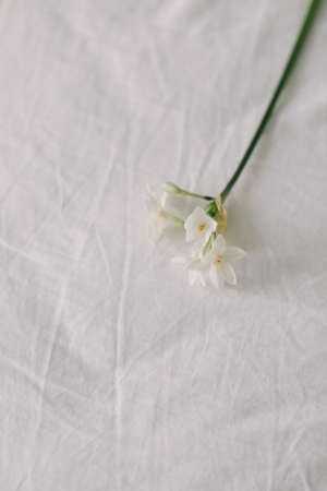 narcissus, daffodil spring flower on bed sheets