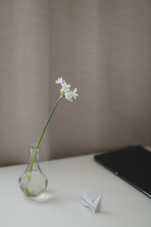 Spring indoor still life. White blooming daffodil in flower pot on old window sill. Easter floral home decoration. Feminine lifestyle Selective focus, top view. No people, vertical composition.