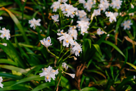 Fringed iris japonica flowers. They grow in clusters in the shade of trees in forests and bloom in early summer with purple and yellow patterns on the petals.
