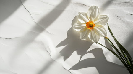 White daffodil on a white background with shadow from the sun