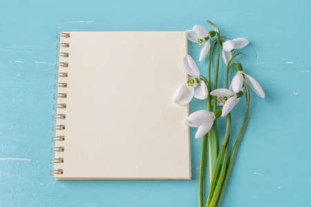 Blank notepad page and fragile snowdrops or Galanthus Nivalis flowers against blue wood desk. Vintage spring season holidays greeting card mock-up. Copy space. Top view.