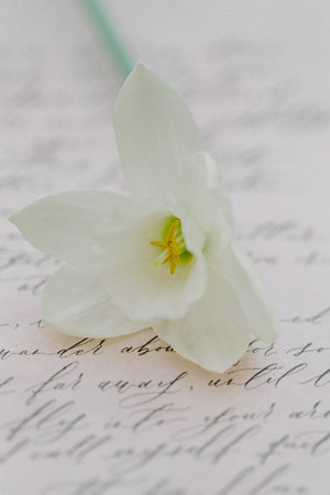 Delicate romantic bouquet of daffodils in an open book.