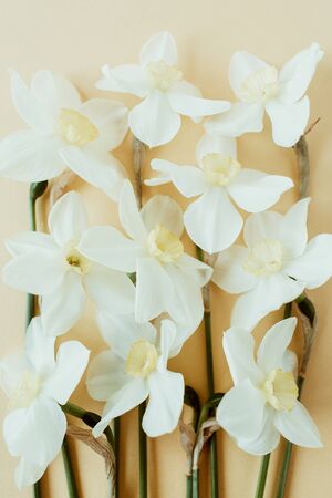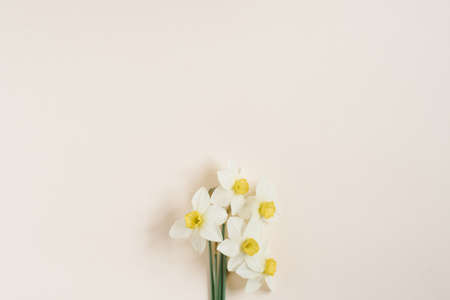 Beautiful fresh daffodils on a beige background top view. an unusual spring image with white and yellow flowers with copy space and flat lay. flower greeting card