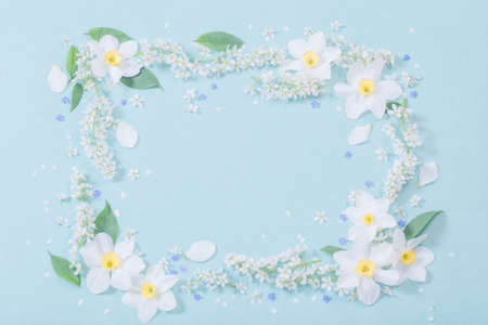 Spring flowers border on blue paper flat lay. Stylish floral greeting card with space for text. Hello spring. Earth day concept. White spring snowflakes flowers growing on blue background