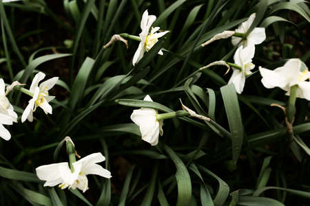 White Japanese winter daffodils in a garden