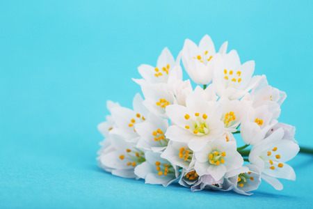 white spring flowers on blue background