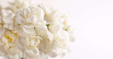 Floral composition made of beautiful white flowers on light backdrop. Floristic decoration. Natural floral background with carnations.
