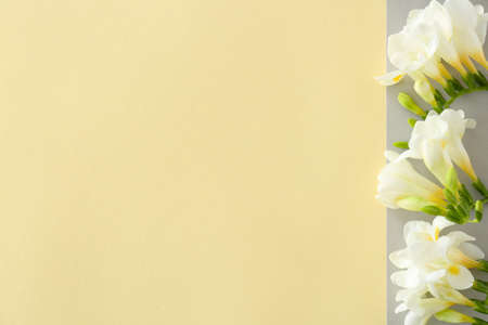Beautiful freesia flowers on color background