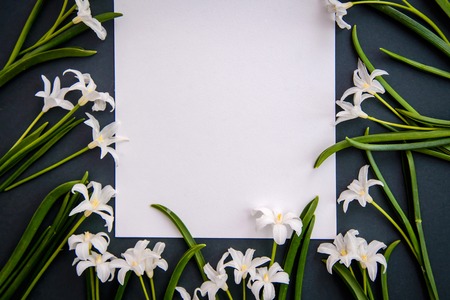 Small white spring flowers Chionodoxa and a piece of paper on a dark green background with copy space